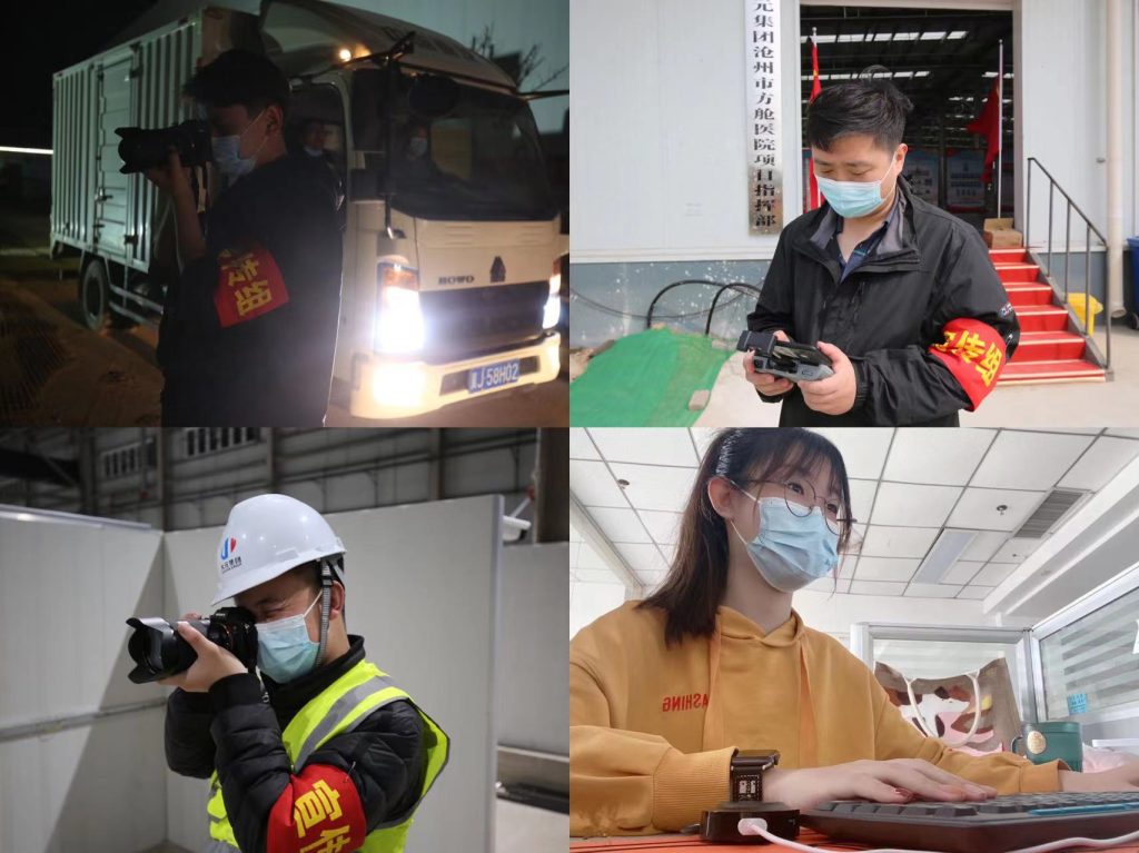 宣传组由集团总部张名阔、刘家成,三建公司张嘉骏、郭晓龙,创元文化公司高鹏、谷维龙,建筑工业化集团曲铭悦组成,负责视频剪辑、拍摄、航拍等任务,分为2组,24小时轮岗不轮休,持续奋战在方舱医院项目一线。他们每天肩扛负重超20斤的摄像机、三脚架穿梭在项目现场,运用航拍多角度、全方位记录方舱医院实时建设情况,拍摄近10000张照片,录制视频2000余条,总计容量近400G。党群文化中心崔艺璇,配合一线宣传,负责新闻编辑发布。用实际行动诠释了新时代大元青年的使命与担当。