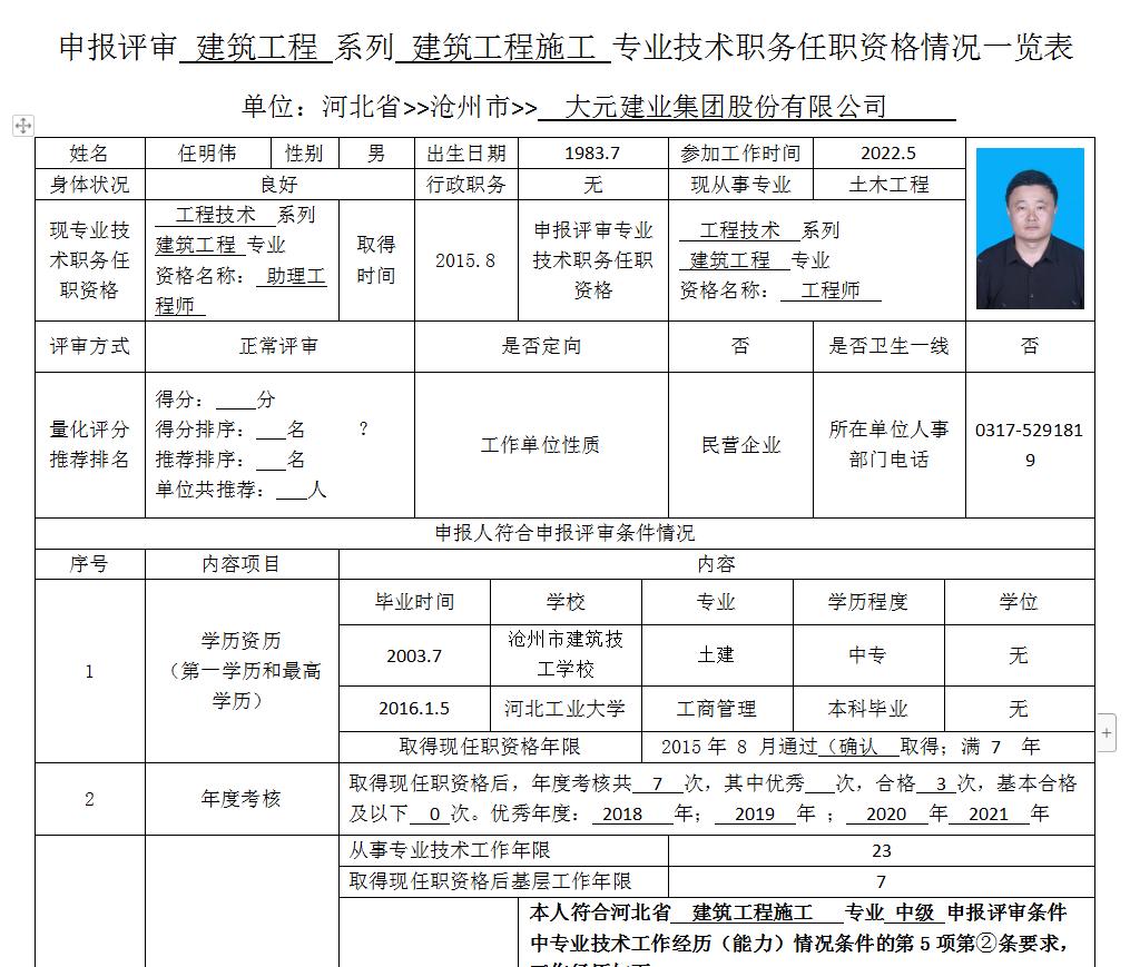 任明伟申报评审工程技术系列建筑工程专业技术职务任职一览表