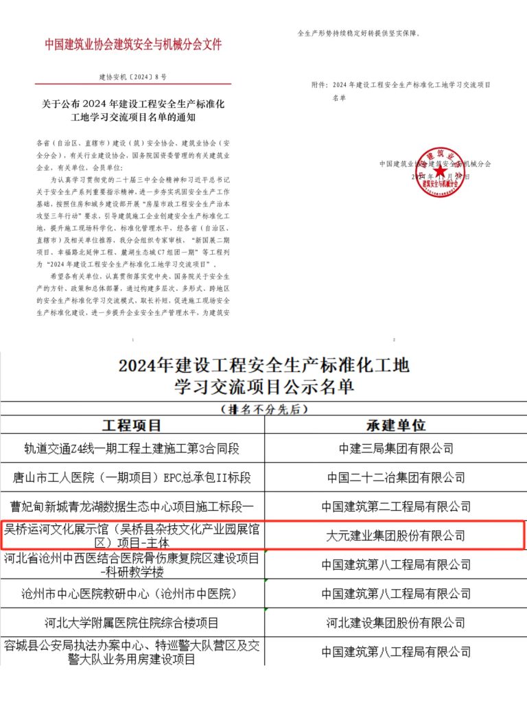 近日,星空体育·星空官方网站-星空体育(中国)承建的吴桥运河文化展示馆项目荣获“2024年建设工程安全生产标准化工地学习交流项目”称号(原“国家AAA级安全文明标准化工地”)。该奖项是全国范围内建筑安全文明施工的最高奖项,被誉为安全文明施工方面的“鲁班奖”。星空体育·星空官方网站-星空体育(中国)凭借严格的项目安全管理与文明施工要求,连续多年获此荣誉。